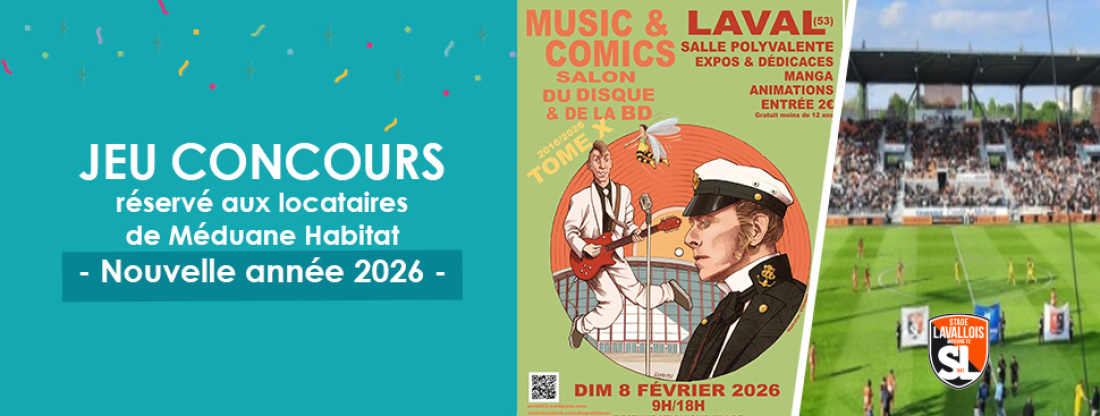 - Des lots de 2 places VIP pour le match Laval-Annecy du vendredi 13 février 2026 à 20h comprenant l’accès au match, l’apéritif avant la rencontre et durant la mi-temps, ainsi que le repas après le match (Attention : Si vous gagnez, vous ou votre conjoint devrez obligatoirement être présent à la soirée. La deuxième place est pour la personne de votre choix, locataire ou non de Méduane Habitat. Ainsi, assurez-vous d’être bien disponible ce jour-là si vous participez pour ce lot).